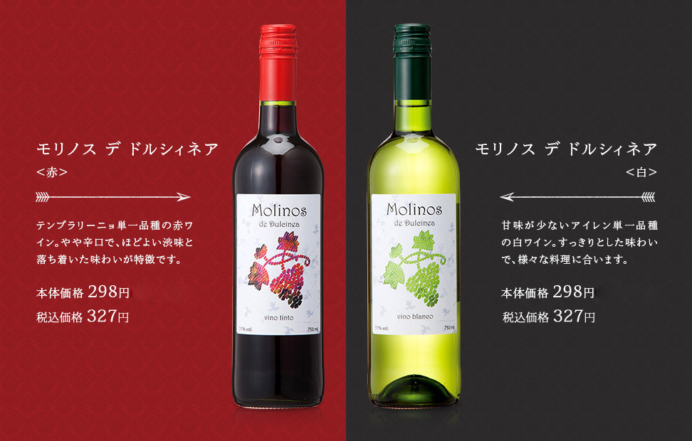 ・モリノス デ ドルシィネア(赤/白)は、750mlで327円(税込)