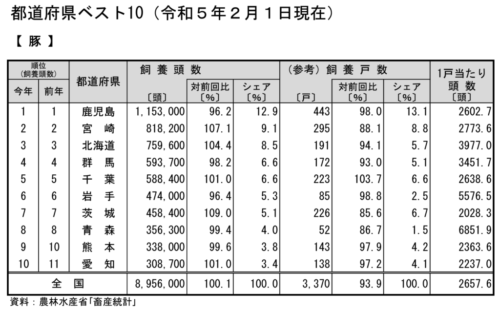 1位の鹿児島や2位の宮崎とはちがい、群馬は少ない養豚農家が多くの豚を育てているんですね!