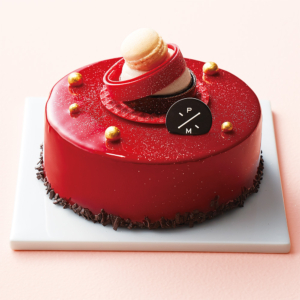 鮮やかな赤いグラサージュの中に、濃厚なビターチョコレートムース、マロンとカシスのハーモニー。